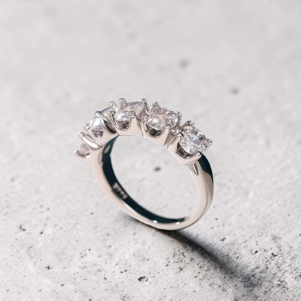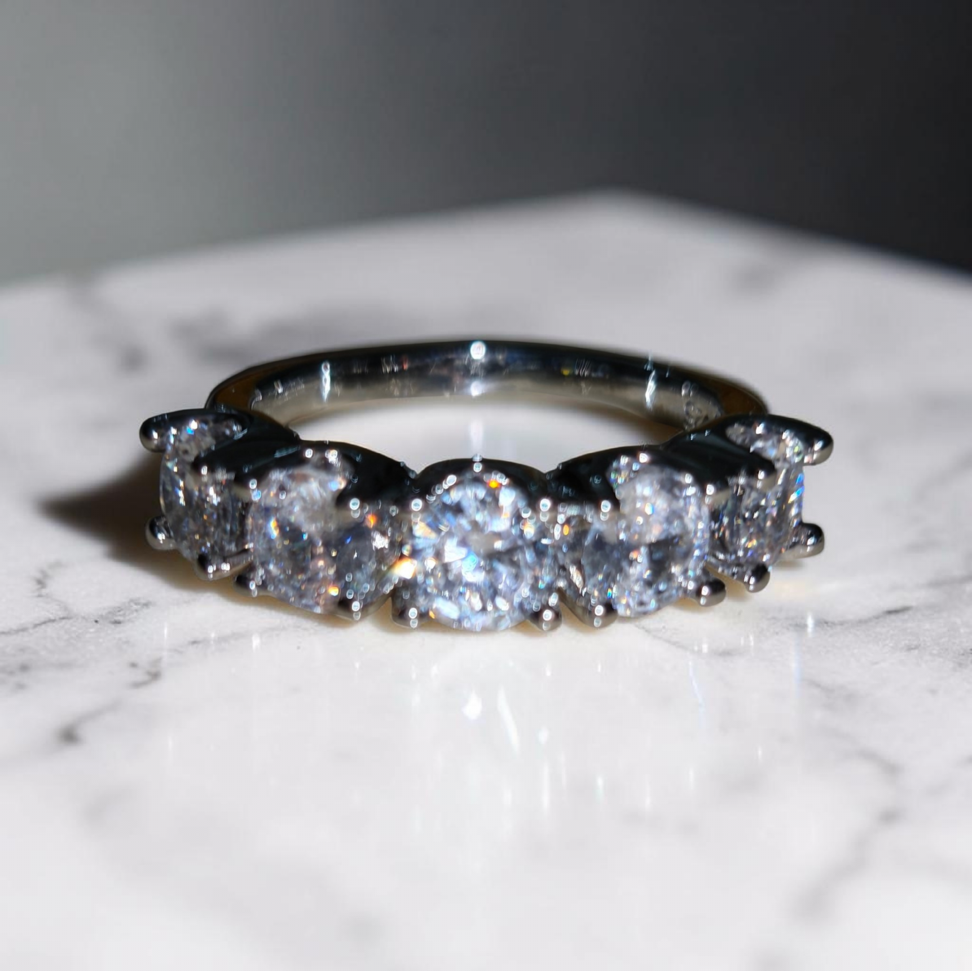 Stupendo anello in argento 925 con 5 favolosi diamanti in moissanite d color incastonati a griffe. Il totale delle pietre misura 4 carati .